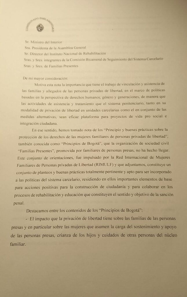 En un documento de recomendaciones dirigido al Ministerio del Interior, al Instituto Nacional de Rehabilitación, a la Comisión Bicameral de Seguimiento del Sistema Carcelario y a nuestra organización, el Comisionado destacó —entre otras afectaciones negativas del sistema carcelario— el profundo impacto que la privación de libertad tiene sobre las familias de las personas presas, en particular sobre las mujeres, quienes asumen mayoritariamente la carga del sostenimiento económico, el apoyo emocional, la crianza de los hijos y el cuidado de otros integrantes del núcleo familiar.